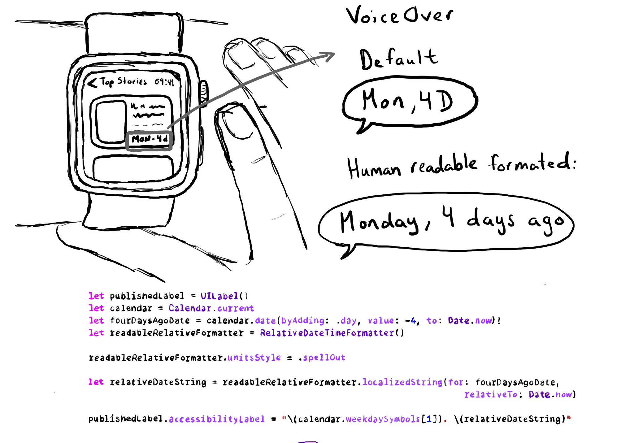Two more examples on better accessibility labels for abbreviations. "4 days ago" is better than "4 D", with a RelativeDateTimeFormatter and a spellOut units style. "Monday" is better than "Mon", accessing the weekdaySymbols from a Calendar. Some useful links: Relative Date Time Formatter: https://developer.apple.com/documentation/foundation/relativedatetimeformatter Units Style: https://developer.apple.com/documentation/foundation/relativedatetimeformatter/unitsstyle-swift.enum/spellout Weekday symbols: https://developer.apple.com/documentation/foundation/calendar/weekdaysymbols