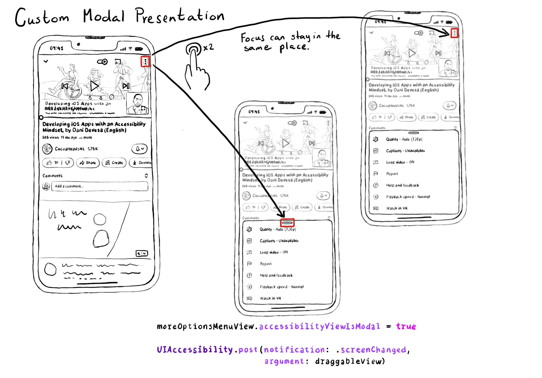 Even when setting a view as modal for accessibility, you may notice that VoiceOver's focus stays in the same place, instead of moving to the presented view. You can post a screen changed notification and pass the view that should get the focus.