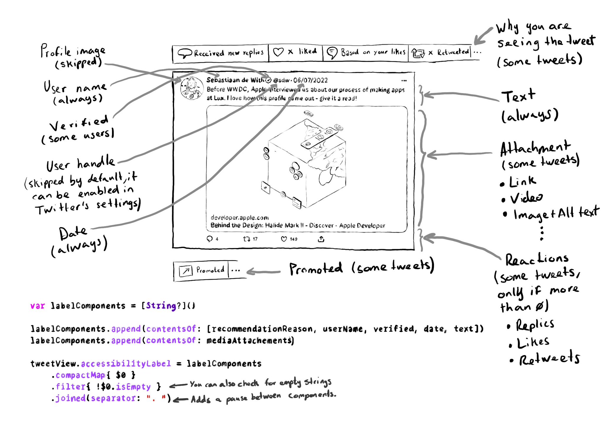 This is a small trick I use to compose complex accessibility labels/values when, for a UI component, some elements might not be in all its instances. An array of optional Strings, compact map, and join all elements by a separator, like a comma.