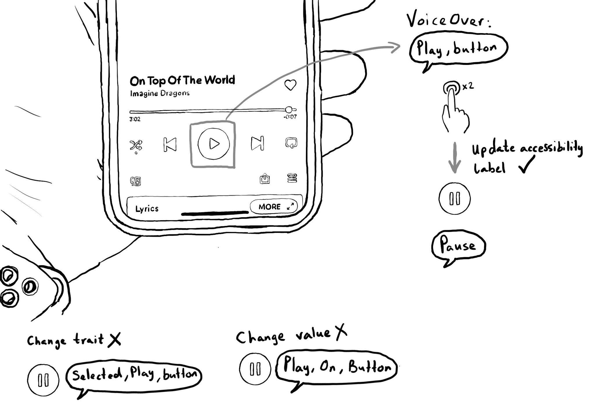 Sometimes, buttons change meaning, for example when toggled. An example is a play button, tap it and it becomes a pause button. In such case, updating its accessibility label will be clearer than trying to convey the change with traits or values.
