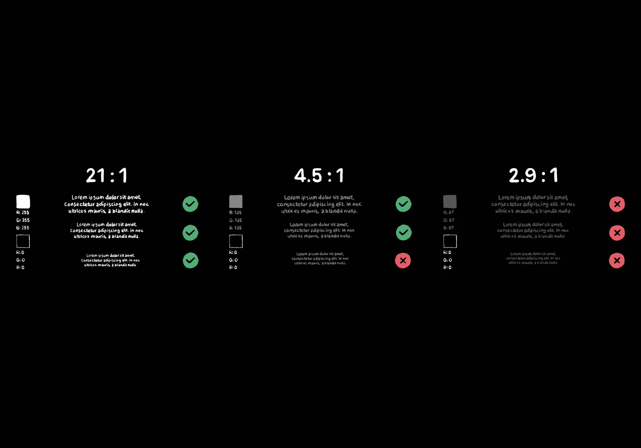 Color contrast between text and background is very important for perceivability. As colors come closer to each other, they’re more difficult to distinguish. Notice that colors that work well with big font sizes may not for smaller text.