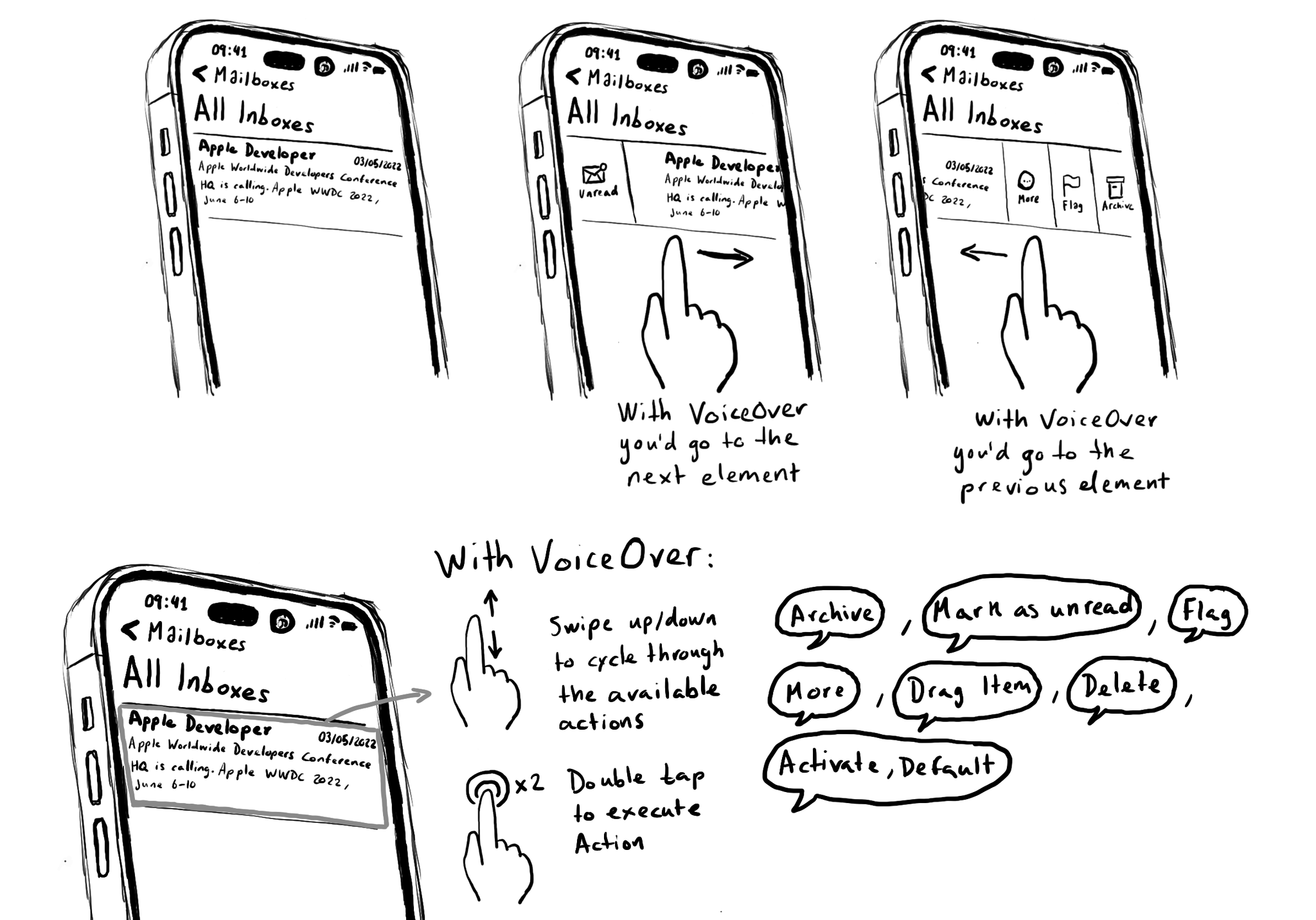 Custom actions are also great for actions that are executed with a gesture that is overridden by VoiceOver. Think of the unread, flag and archive hidden options that you can make visible by swiping left/right on a message row in the Mail app.