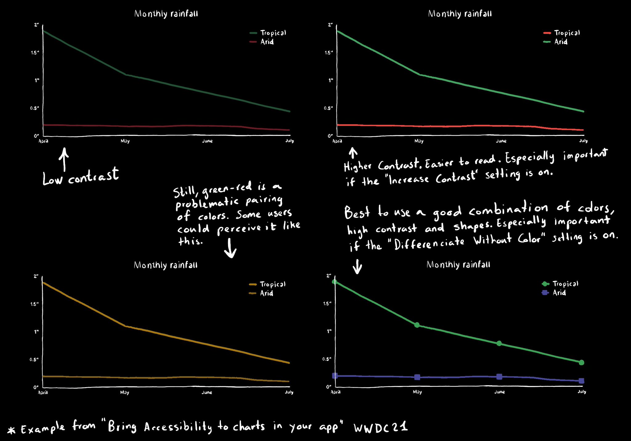 Some good practices when it comes to charts and data visualizations: use high contrast colors, avoid problematic pairings (red-green, blue-yellow), use symbols as well as colors...
