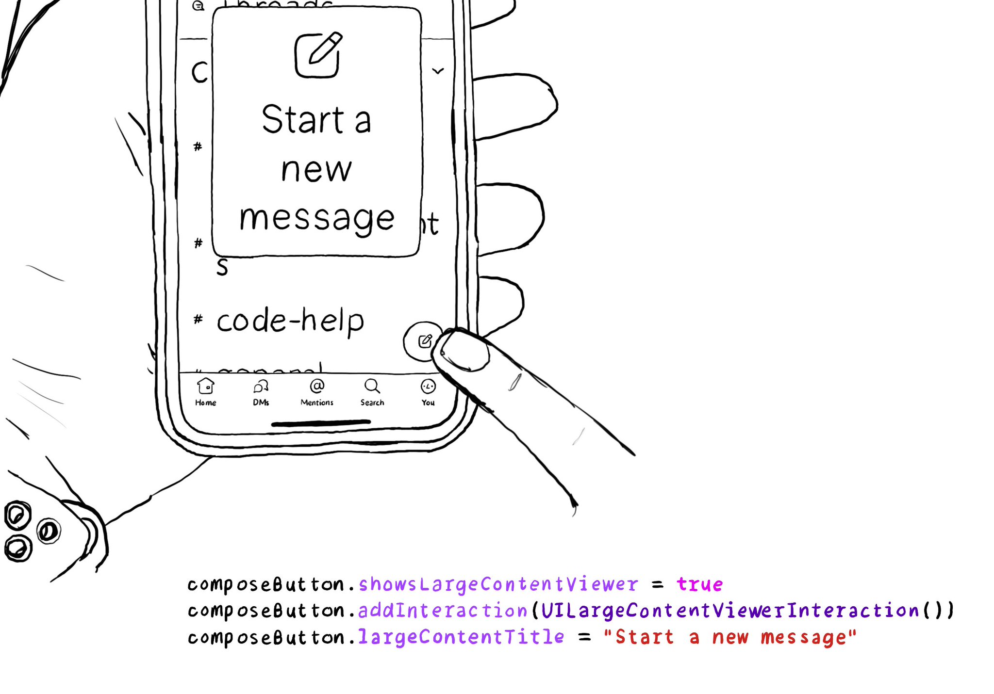When implementing the large content viewer, UIKit components will usually have a large content title and image configured for you. But if you are developing a custom component, or you want to add info to a native component, you can do so.