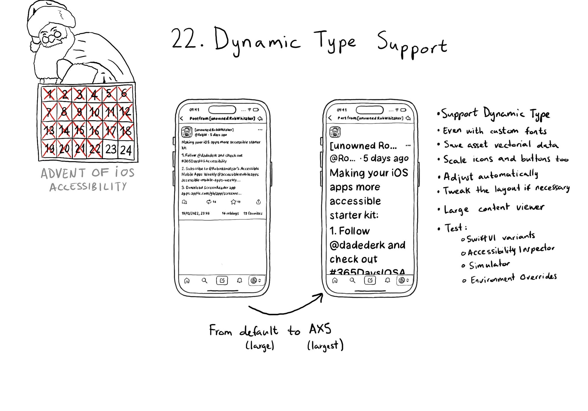 Make sure you support Dynamic Type up to the largest text size available. Take into account that there are five extra accessibility sizes available from the Accessibility Settings. It can make a huge difference for lots of users.