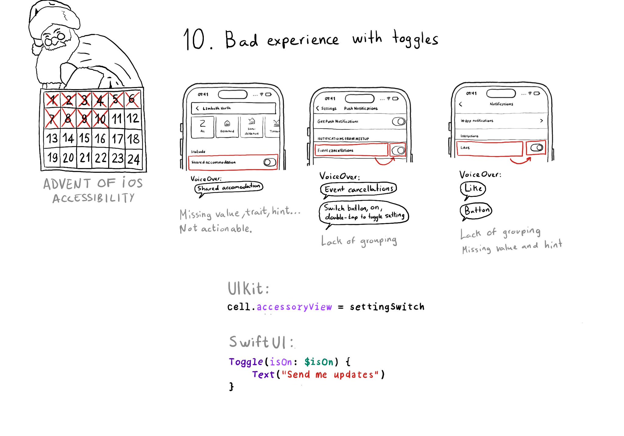 Toggles or UISwitches are often found separated from the label that precedes (and describes) them; with an unclear label; missing a value, trait, or hint; or even not being actionable at all.