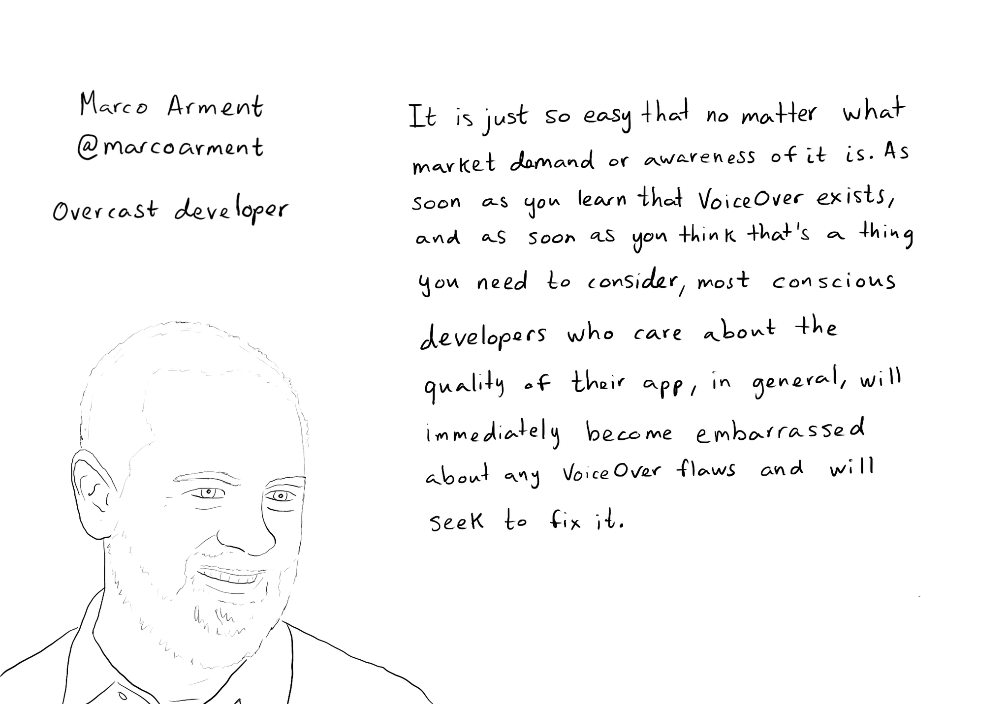 While you are at @shelly's "36 Seconds That Changed Everything", I would definitely also check out the Bonus Content. Including the full interview with @marcoarment. "Awareness is the biggest problem here." https://www.36seconds.org/behind-the-scenes/ "Cause iOS 7 was so inaccessible in so many ways (...) it started getting under developers’ radars this section of settings, called accessibility, that changes the way my app looks or works and I need to make sure that it doesn’t break under those settings.” "There’s so much variation out there. We no longer have just one size phone, we no longer have just one font size. It is easier for us as developers not to fall into bad assumptions of how I see it is how everyone is going to see it.” "The good thing about VoiceOver is that the accessibility framework is pretty well built-in the standard controls. For a given app you can fix any VoiceOver problems it has in one day or less. Even if it is a complex app. Even if it has a lot of custom controls." "What developers now do, if they care, is they treat that (accessibility issues) as if it was any other design flaw. If any other screen in your app broke visually or functionally you’d consider that a bug and you would try to fix it in the next update.” "I think the more that we can do as a developer community to talk about these features even existing, and these problems existing, and to tell people how easy it is to fix. That is the best any of us can do to help. Awareness is the biggest problem here."
