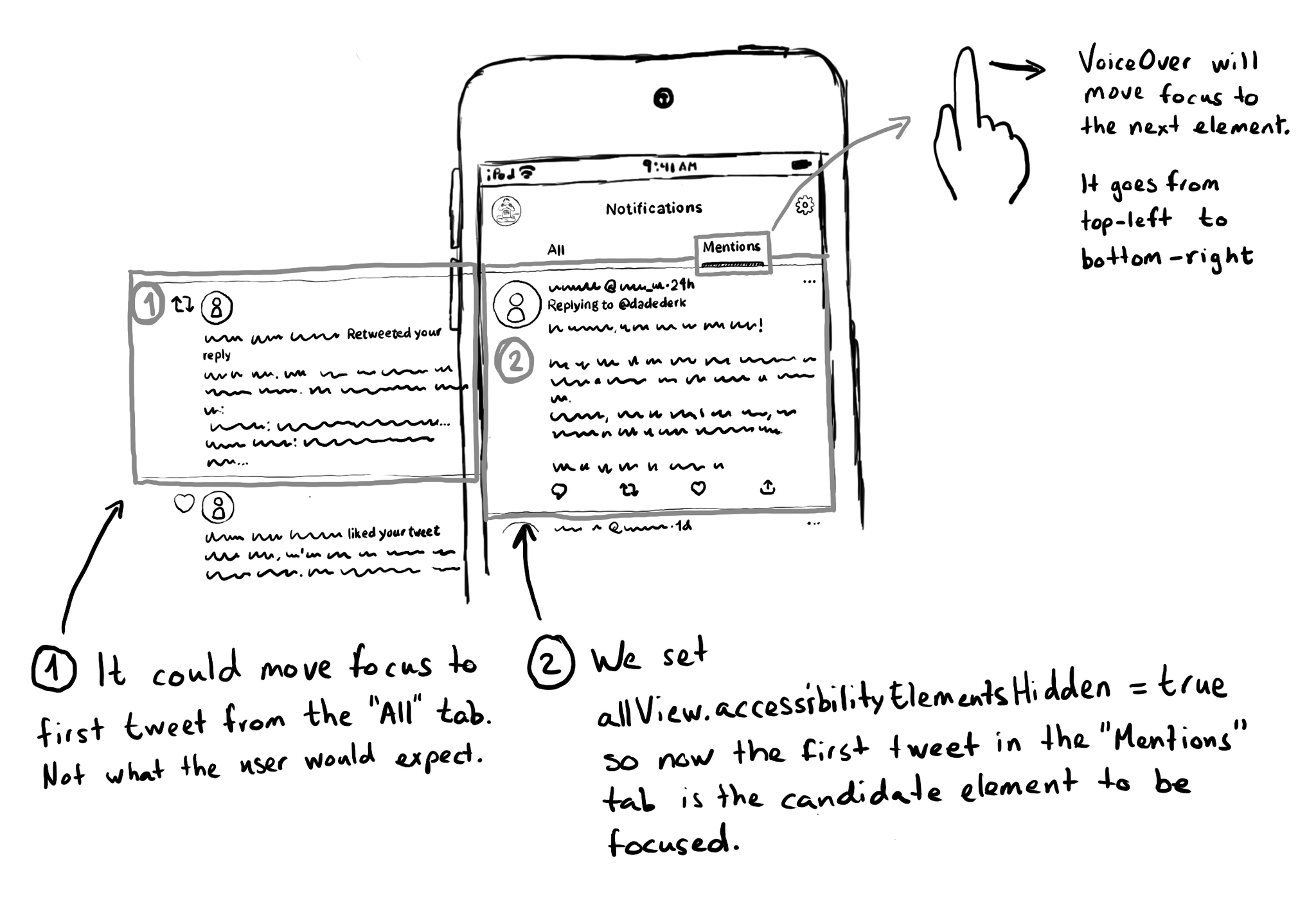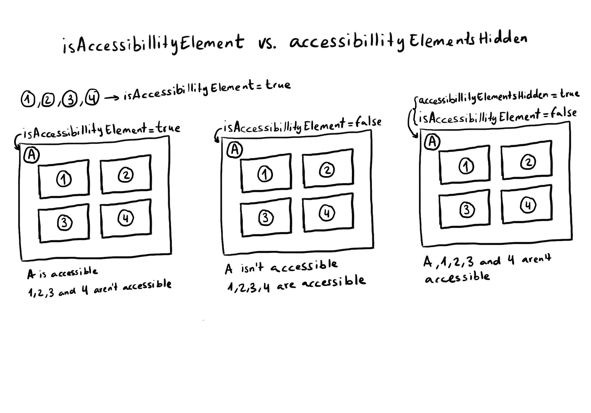 What is the difference between isAccessibilityElement and accessibilityElementsHidden? The first one makes the view not accessible, but its subviews can still be accessible. The second one hides the view and all its subviews from assistive tech.