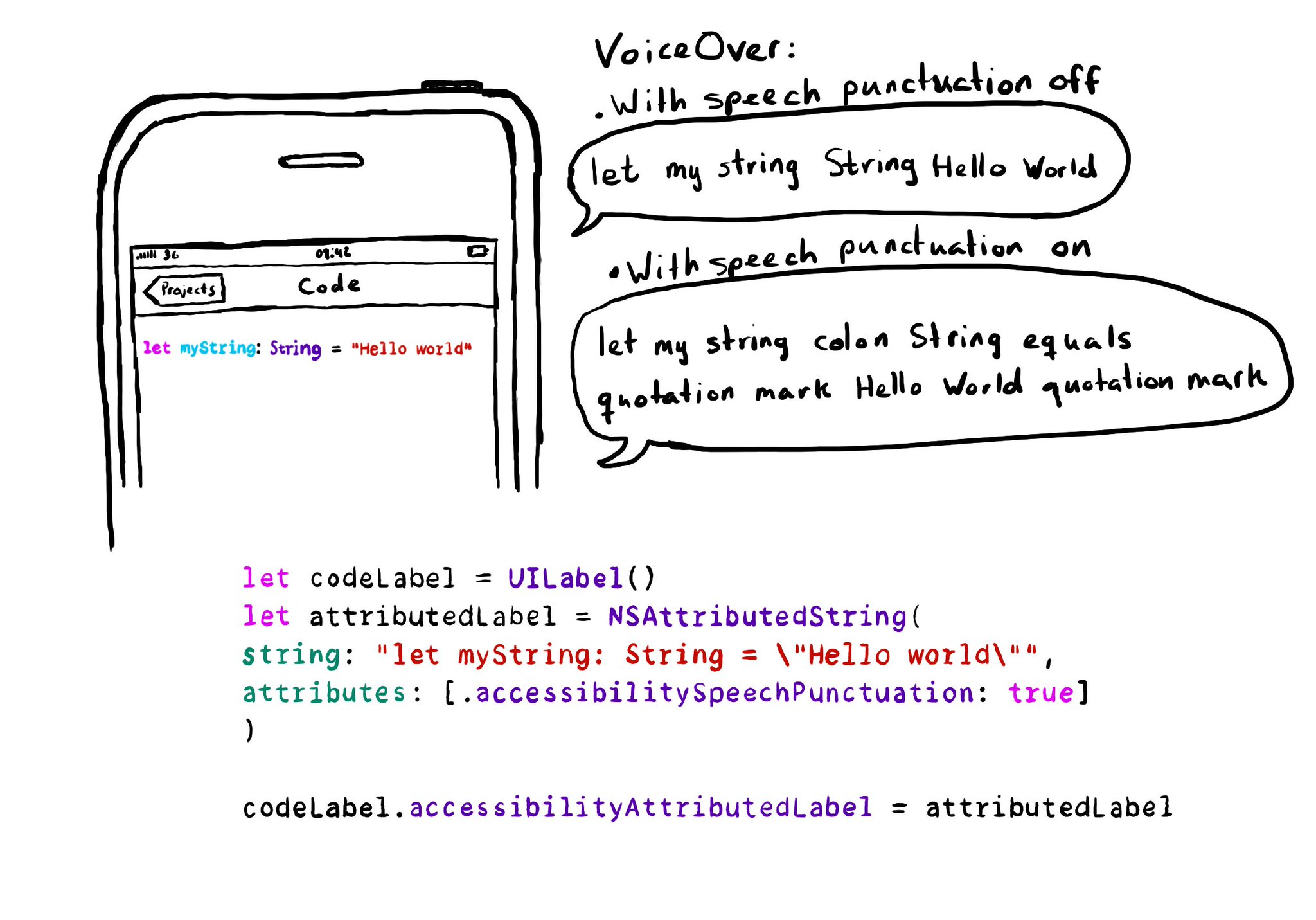 With the attribute accessibilitySpeechPunctuation, you can ask VoiceOver to speak any punctuation marks in your attributed accessibility label, if that is what you want. Good for code snippets?