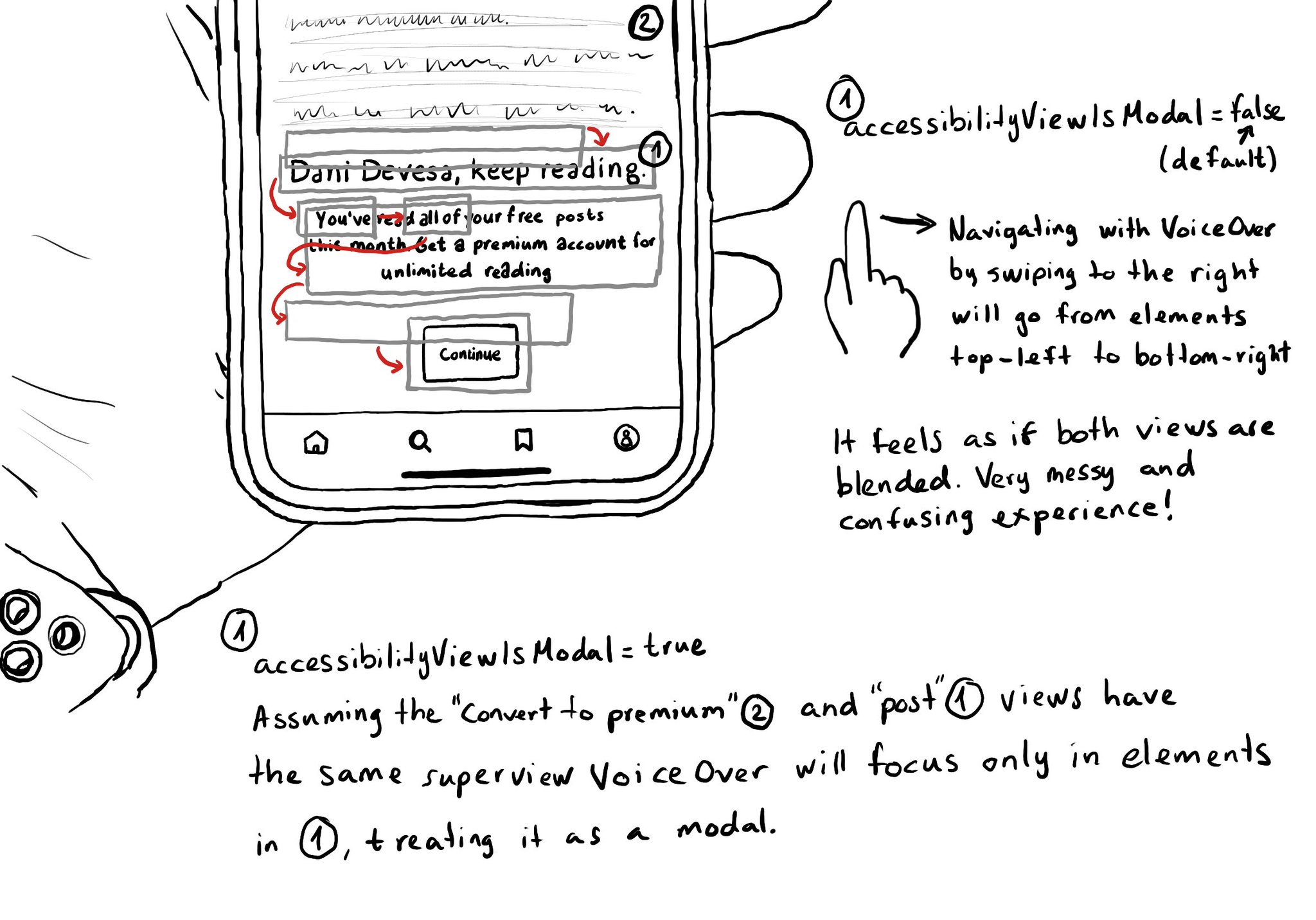 When presenting a UI component that overlays the existing UI, you may have found that VoiceOver starts to randomly jump between the overlaid UI and the elements underneath. To avoid that, you can set its accessibilityViewIsModal to true. When setting the accessibilityViewIsModal to true for a view, VoiceOver will ignore its sibling views, treating it as if it was a modal. Useful when presenting custom popups, popovers, modals, action sheets, etc. https://developer.apple.com/documentation/objectivec/nsobject-swift.class/accessibilityviewismodal