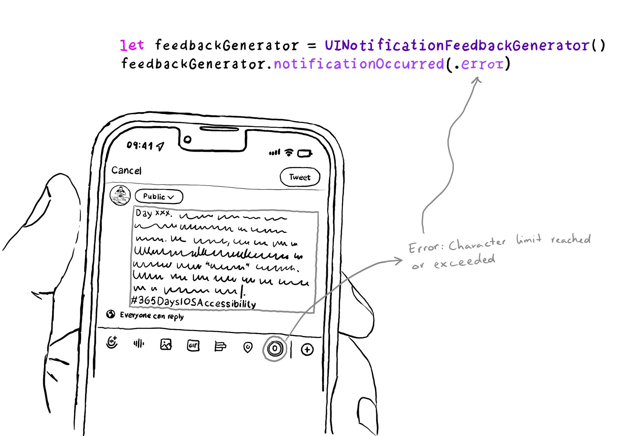 You can indicate that an error occurred using haptic feedback. It can be useful for long-running tasks that fail, like page loads or downloads. But you can also use it as errors occur like Twitter does when reaching the character limit.