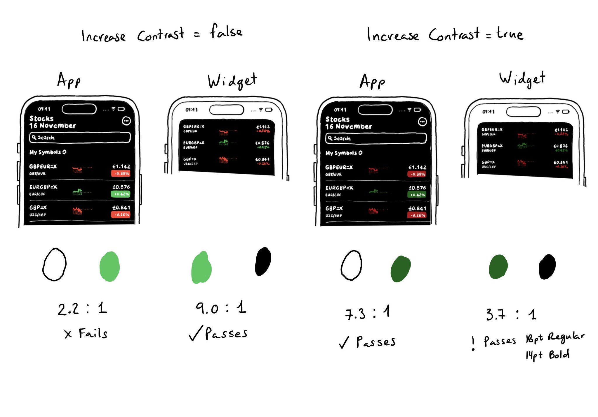 If you don't use Color Sets in your Asset Catalog, and you define your color palette in code, you can still check if the user has Increase Contrast enabled to offer a slightly different color that improves the contrast ratio even more. Day 192 (2/2). You can check if the darker system colors is enabled: https://developer.apple.com/documentation/uikit/uiaccessibility/isdarkersystemcolorsenabled Listen to a notification in case this setting changes: https://developer.apple.com/documentation/uikit/uiaccessibility/darkersystemcolorsstatusdidchangenotification And also check if the accessibility contrast is high in your trait collection: https://developer.apple.com/documentation/uikit/uitraitcollection/accessibilitycontrast