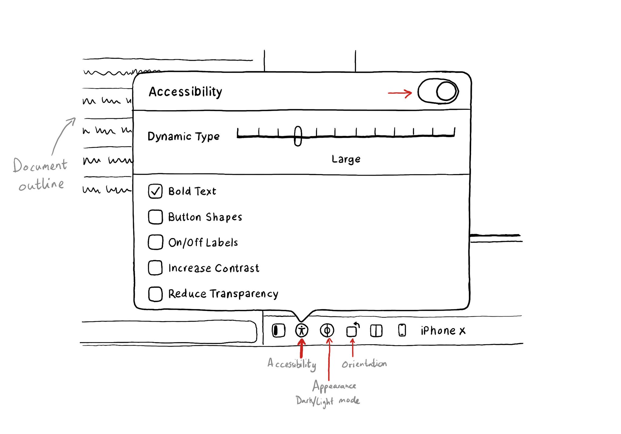 In addition to being able to test some accessibility options in the simulator using Environment Overrides. You can even preview some of these options before even running the app in the simulator with this Accessibility panel in Interface Builder.