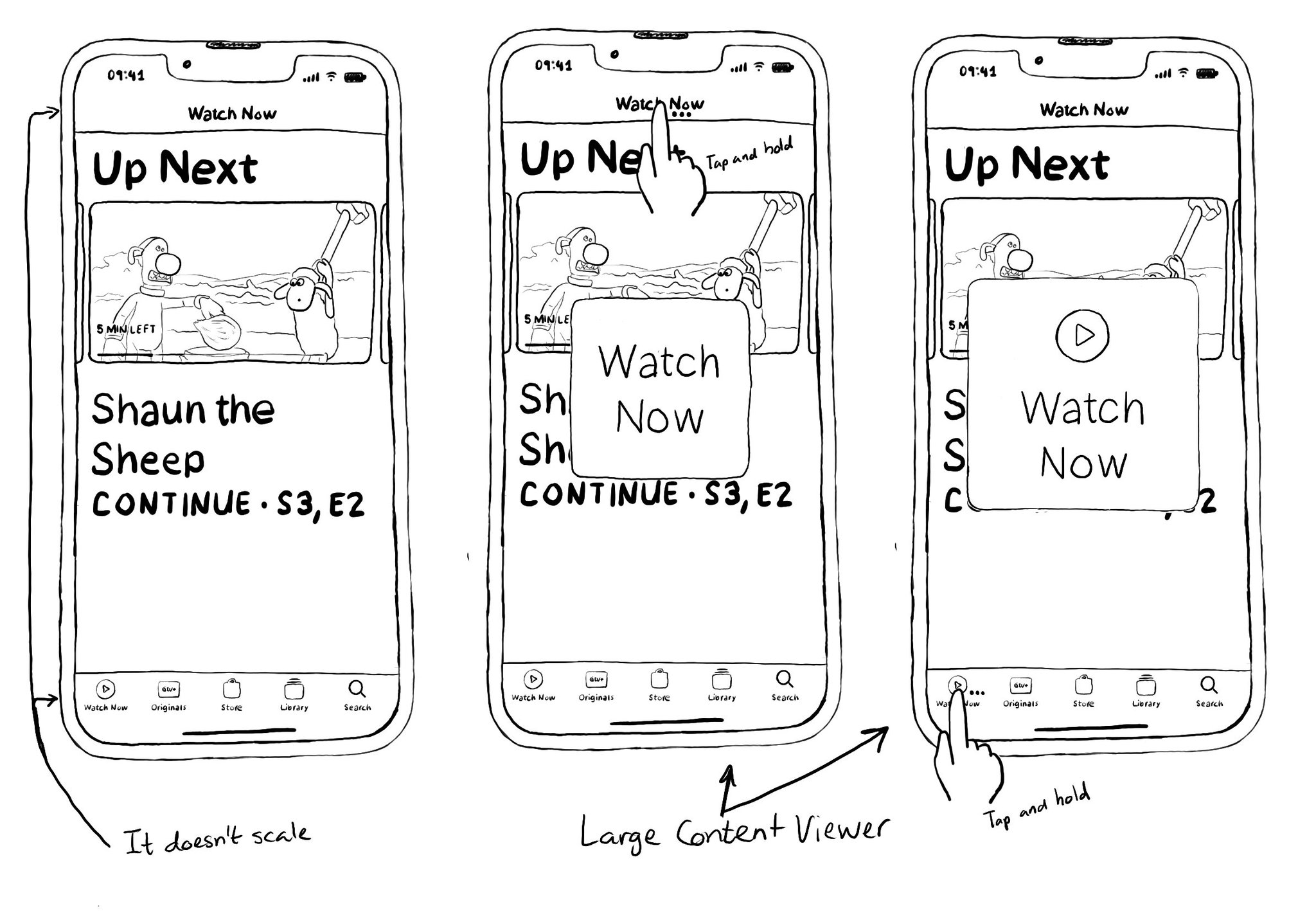 You may have noticed that navigation/tool/tab bars don't scale with large Dynamic Type sizes. It would take too much space from the screen leaving very little real estate for the actual content. A tap and hold will show the Large Content Viewer.