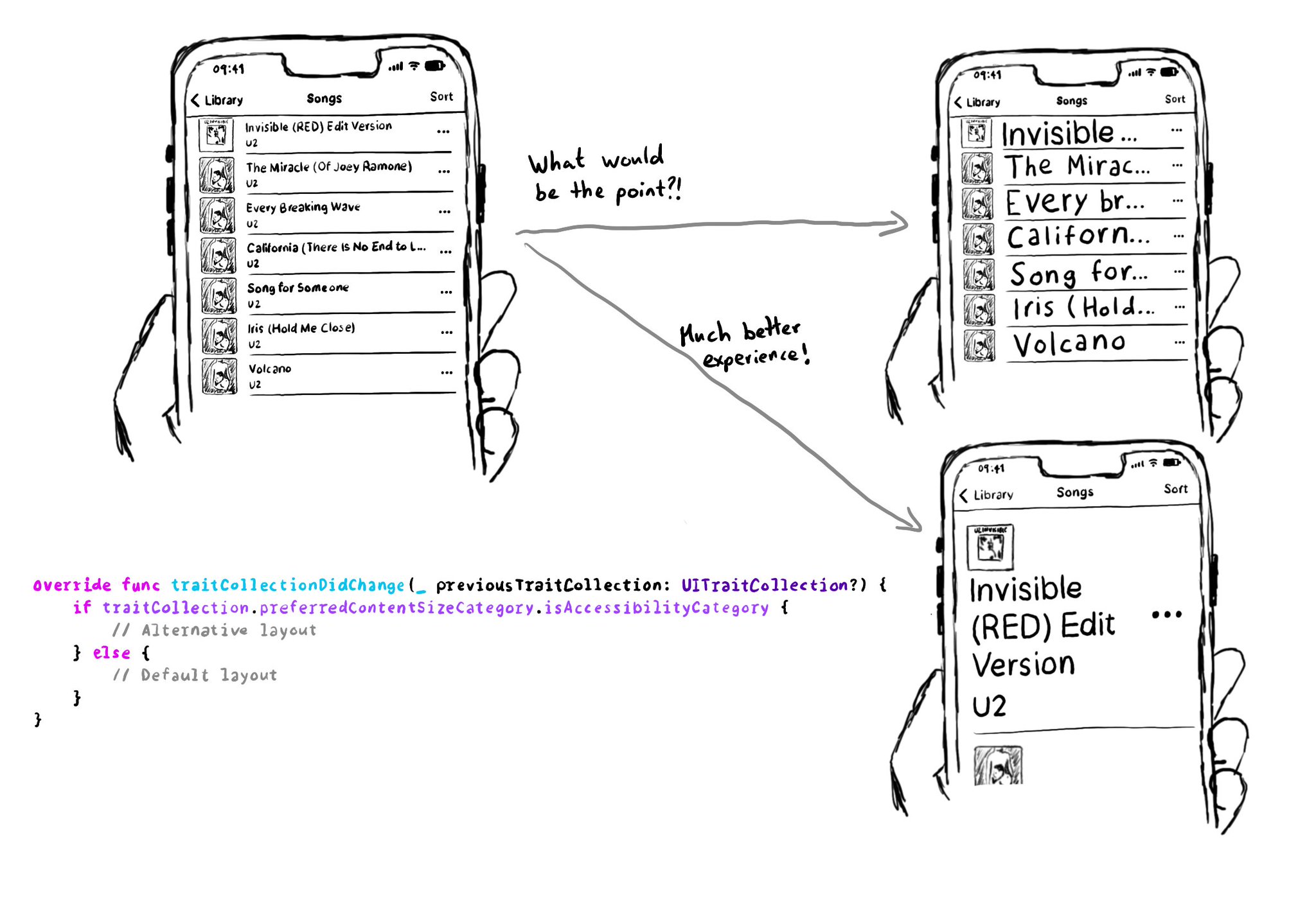 Sometimes, with large font sizes, there's no other way around it but to offer an alternative layout. Small tweaks are often enough. Otherwise, the text will be barely readable. Larger text shouldn't mean less content or a worse experience. One thing you can do is to check if the preferred content size category of a view is an accessibility category. And, in that case, move things around to make room for the text, offer more lines of text, etc. https://developer.apple.com/documentation/uikit/uicontentsizecategory/isaccessibilitycategory