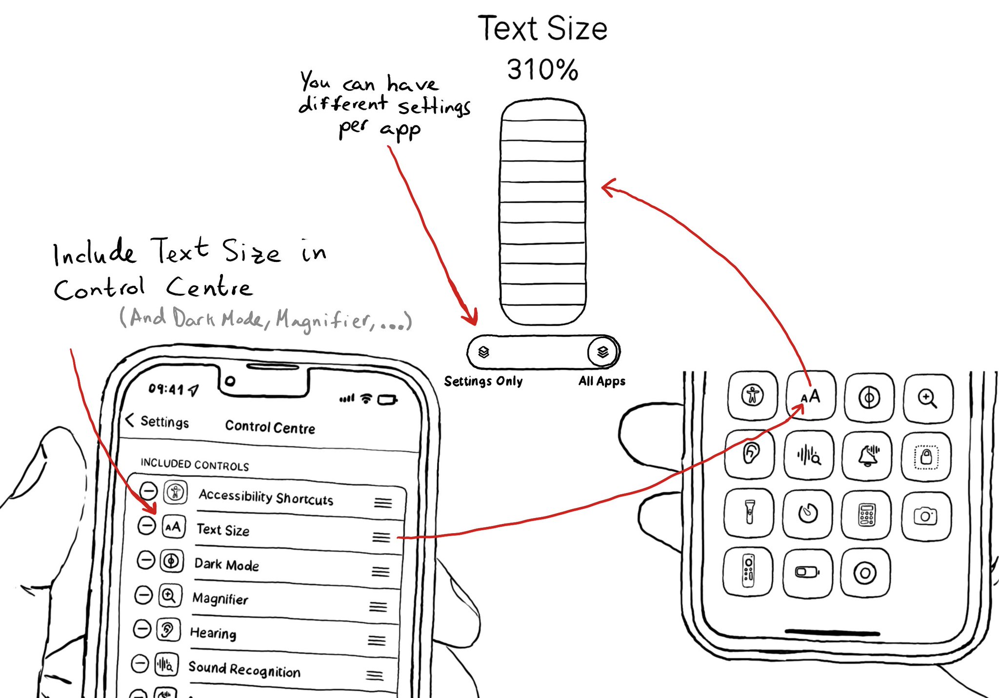 Text Size is one of my favorite Control Centre controls. It lets you quickly change the Dynamic Type size, of the whole system. But also, you can now specify a different setting per app. Also, check out Dark Mode, Magnifier, Sound Recognition...