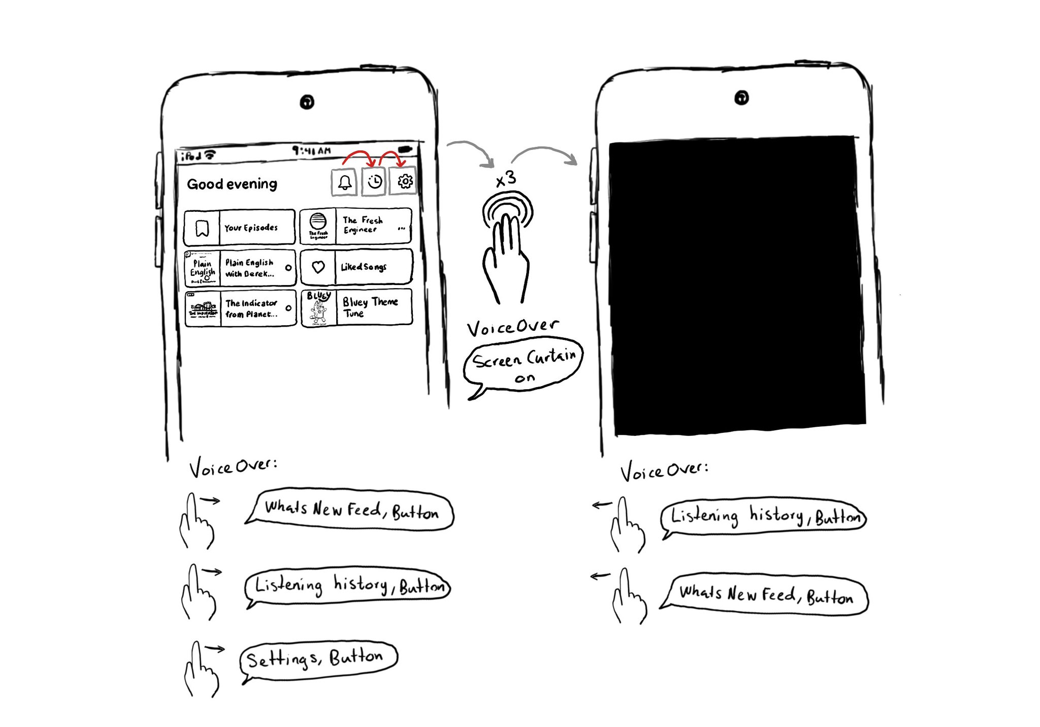 This is my favorite way of testing VoiceOver. Pick a flow in your app. Turn VoiceOver on. Triple tap with three fingers on the screen to enable Screen Curtain. The screen goes off but you can still navigate your device with VoiceOver.