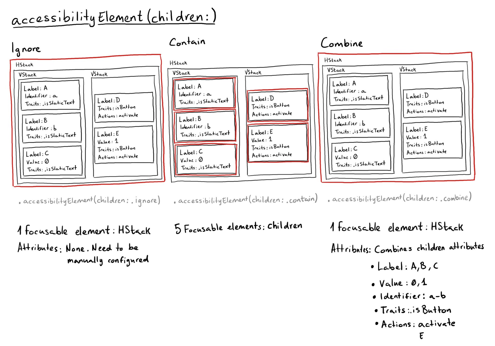 In SwiftUI there is a very useful modifier accessibilityElement(children:), that will do very different things depending on the AccessibilityChildBehavior passed as a parameter. There are three options: ignore (default), contain, and combine.
