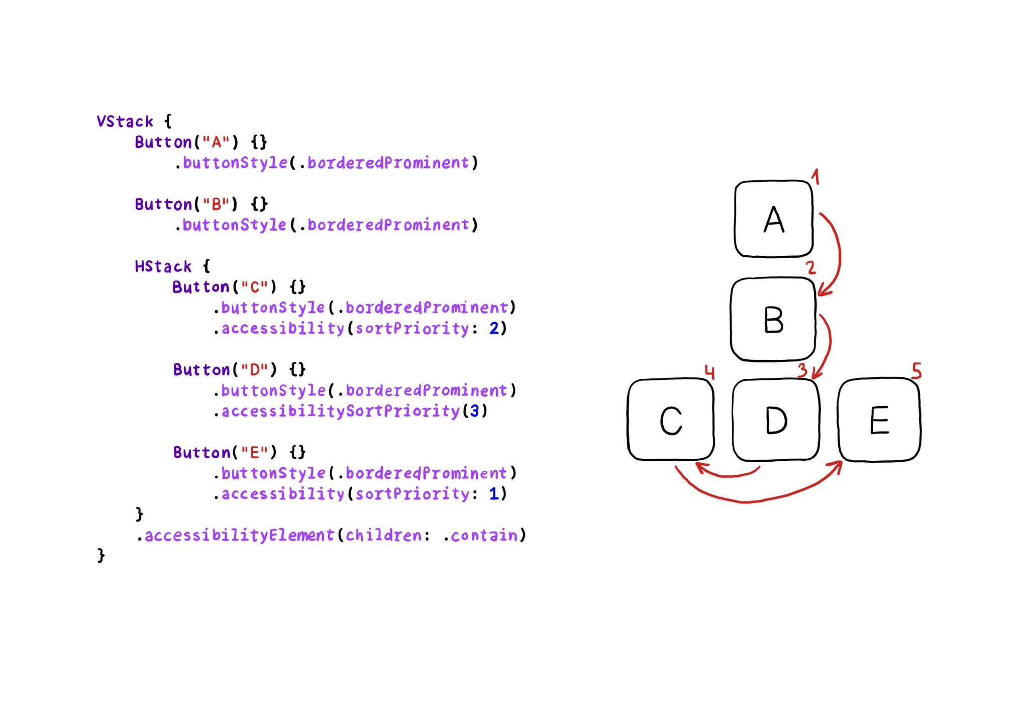 VoiceOver will traverse elements from left-right, and from top-bottom. If for any reason you need to change that order, in SwiftUI you can change the accessibility sort priority. A higher priority number in the container means it will go first.