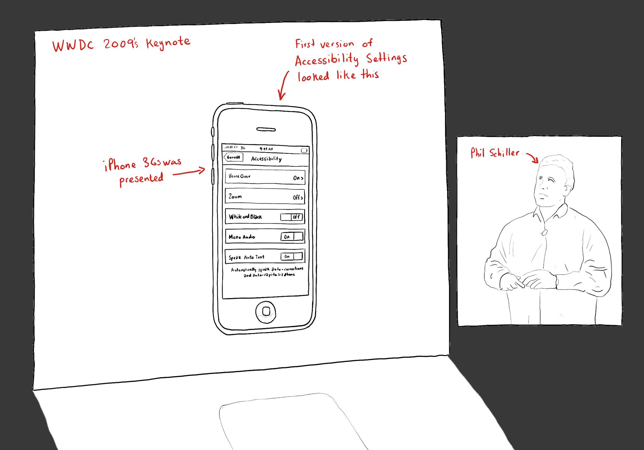 WWDC 2009's keynote, Phil Schiller spoke for 36 seconds, about how the iPhone was, two years later, finally accessible. @shelly tells this amazing story in her audio-documentary "36 Seconds That Changed Everything" https://www.36seconds.org/2019/06/19/36-seconds-transcript/ "Apple didn’t develop VoiceOver for Mac out of the goodness of their hearts. They developed VoiceOver for Mac because if they didn’t they were going to be in serious trouble with their key market, which was education," @JonathanMosen says. "They did that thinking a third party would write the screen reader for Mac OS 10, and then when really nobody picked up that mantle to write the screen reader as a third party, Apple stepped in and developed VoiceOver," @jamesdempsey says. "I borrowed a friend’s phone. It was confirmed. The screen was too small, the background too bright, the text too tiny. For the first time in 20 years, Apple had built a product I couldn’t use. I’m fairly sure I cried about that." @shelly Four minutes before the two-hour mark, in the midst of a long list of new apps to be included on the iPhone 3GS, @pschiller switched slides, revealing the iPhone Accessibility settings screen. “VoiceOver is on the iPhone. They did it.” "I bought myself an iPhone at the same time as other people. I didn’t have to wait for a new version of the software, an update to be made, or someone sighted to help me. I could start up VoiceOver and it just worked great." @SteveOfMaine