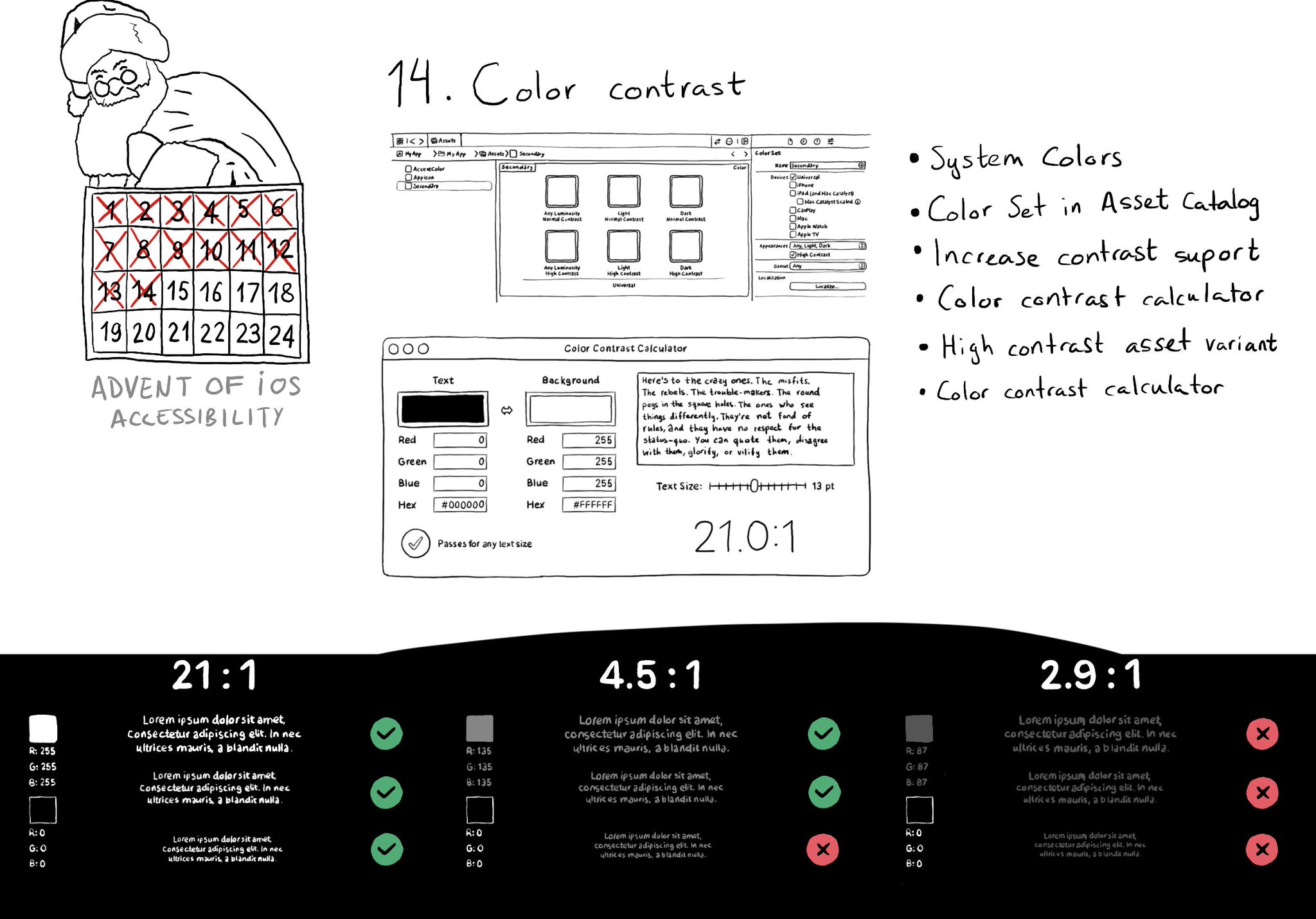 iOS and Xcode provide a wide variety of tools and options to deal with color contrast ratios. From system colors, that automatically support Increase Contrast, to high contrast color and asset variants, and even a built-in contrast calculator.