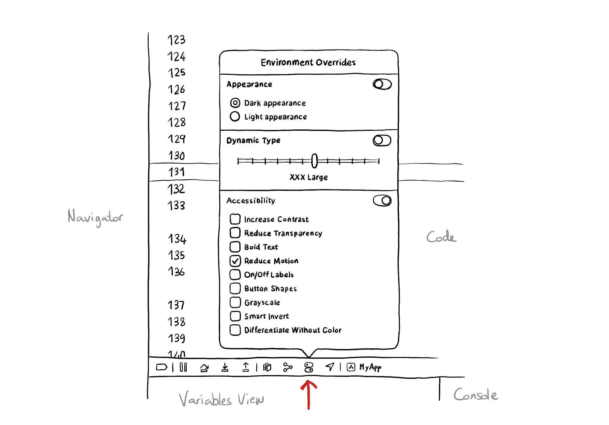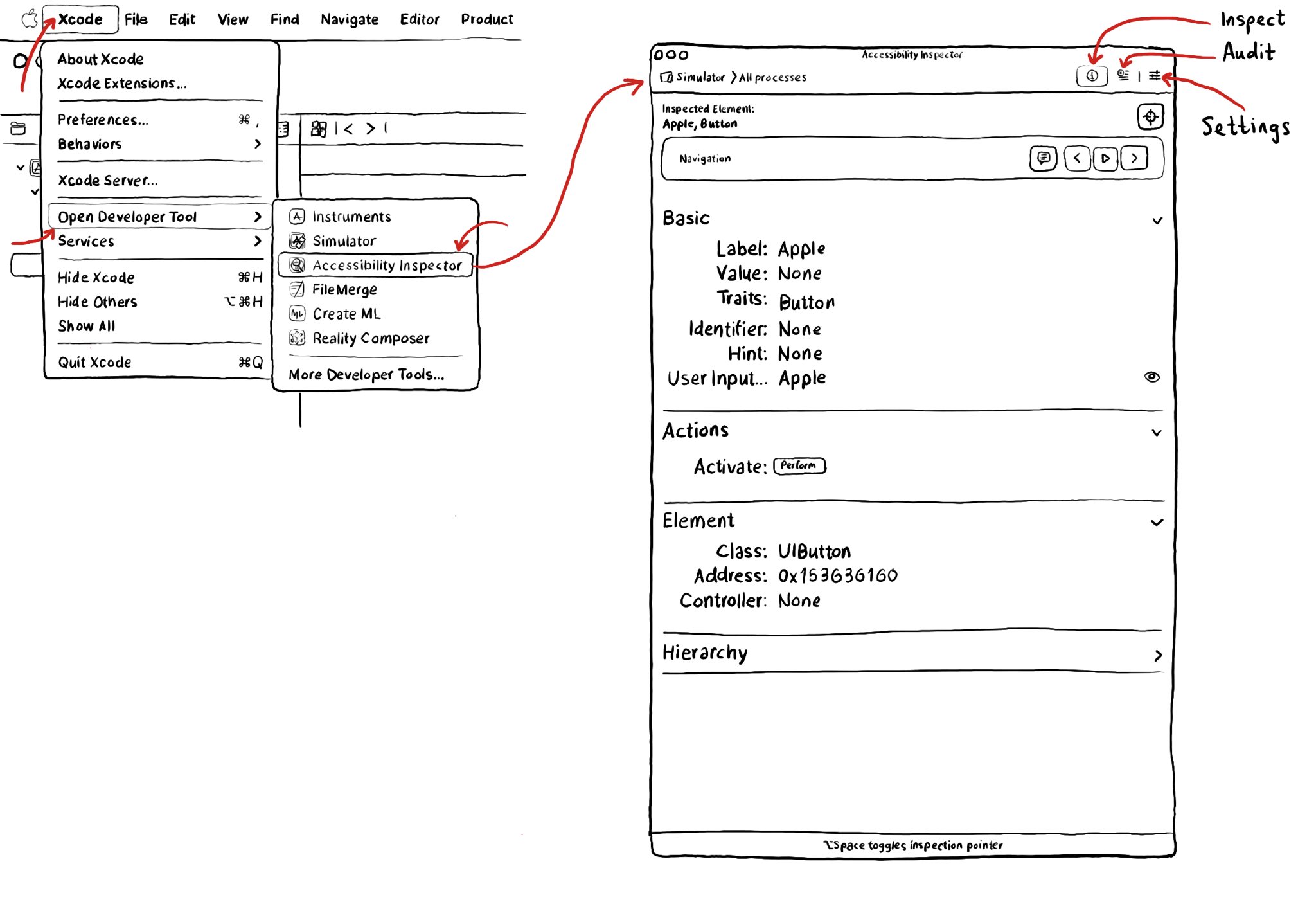 Xcode has a built-in tool to help you develop more accessible apps, the Accessibility Inspector. You can find it in the Developer Tool set in the Xcode menu. It has three main functionalities: inspect, audit and settings.